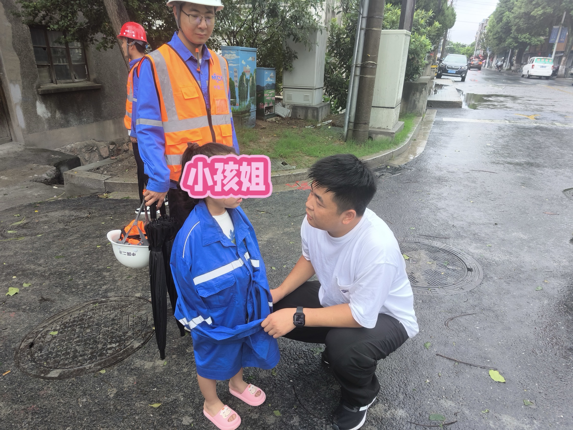 9月16日上午8時,項目部正對項目在建房屋進行防臺風檢查,一個小女孩在風雨中無助地徘徊,顯然是與家人走散了。面對突如其來的狀況,項目部的幾位青年員工立即行動起來,他們迅速上前,將小女孩帶至安全地帶。